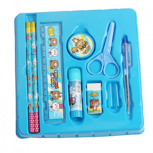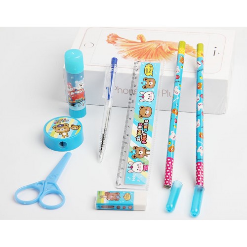 1*sharpener+2*pencils+1*eraser+1*ruler+1*solid glue+2*pen cap+1* scissors