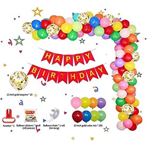 - (PACK INCLUDES)HAPPY BIRTHDAY Pull the flag x1, *12 inch gold sequined balloon x10, 10 inch color latex balloon x100, Balloon knotter x1, Balloon dispensing x100, 5m balloon chain x1