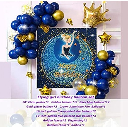 - (PACK INCLUDES)HAPPY BIRTHDAY Poster 70*70cm x1, Golden balloon x11, Dark blue balloon x14, Gold glitter balloon x2, Crown Aluminum Film Balloon x1, 16 inch golden five-pointed star balloon x2, 10-inch golden five-pointed star balloon x3, Golden Leaves x2 Dispensing x1, Balloon chain x1, Ribbon x1