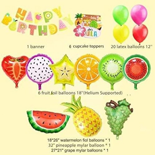 - ( PACK INCLUDES )* 12" latex balloon x20 (Green ,Pink, Yellow, Red) * 18" Fruit aluminum film balloon x6(Watermelon, Star Fruit, Strawberry ,Kiwi, Orange, Dragon Fruit) * 48cm*67cm Watermelon Balloon * 180cm*48cm Pineapple Balloon * 170cm*51cm grape balloon * Ribbon x1