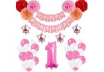 - ( PACK INCLUDES) "HAPPY BIRTHDAY" banner x1 , 12" confetti powder balloons x 12 , 12" Pink latex balloons x 12 , 10" Rose Gold Star foil balloons x 4 , Paper Flower Ball x 6 , 32" number"1" x1 , Ribbon x2