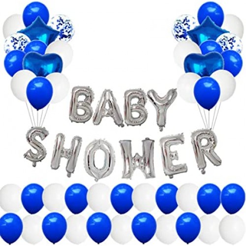 • (PACK INCLUDES)18"Heart foil balloons x2,18"Star foil balloons x2,16"BABY SHOWER x1, 12" gold confetti balloons x4, 12"white balloons x20, 12"gold balloons x20,Ribbon x1,Glue dot x1