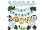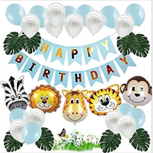 - (PACK INCLUDES)"Happy Birthday" Banner x1 ,10" White and blue balloons x10, Green leaves x8, Zebra, monkey, tiger, lion, giraffe balloon x1 Each, Gift: Ribbon x1, Glue point x1
