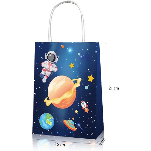 - (SIZE and MATERIAL)Astronaut Space Party gift treat bags are made of quality thick white kraft paper, reliable and durable to use. Size 22*12*8CM, enough space to hold small candies.